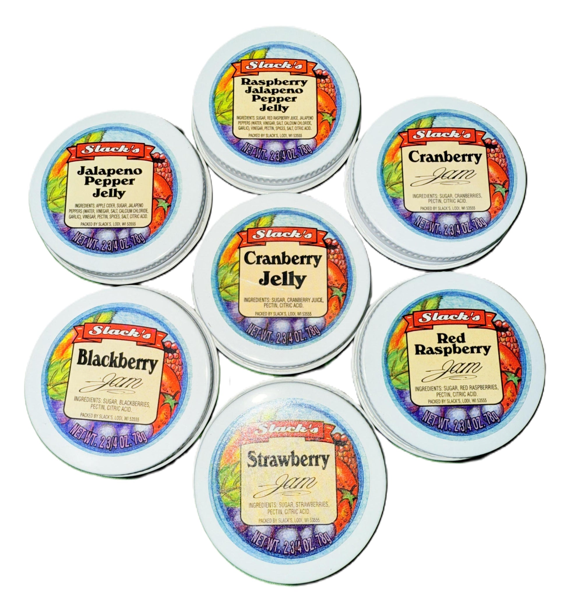 Taste a spread of Wisconsin flavor with Slack’s Jams & Jellies — handcrafted in small batches since 1954. This sampler includes seven of our boldest, fruit-forward favorites, made the old-fashioned way with real fruit, real sugar, and a whole lot of heart.