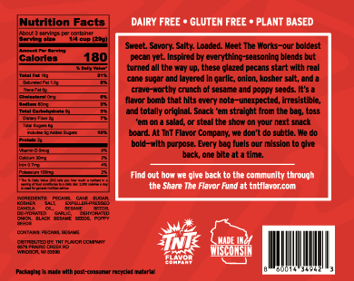 Meet The Works—our boldest pecan yet. Inspired by everything-seasoning blends but taken to the next level, these pecans are glazed with real cane sugar and kicked up with a crave-worthy mix of dried garlic, onion, kosher salt, and crunchy sesame and poppy seeds. It’s sweet, salty, and totally unexpected—in the best way.